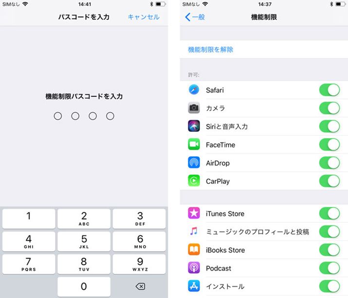 「設定」→「一般」→「機能制限」で、同機能をオンにする場合は、4桁の「機能制限用パスコード」を最初に入力する。このパスワードがあれば、同機能をオフにすることもできるので、子どもに教えてはいけない(左)。機能制限で、使えないアプリを選択できる(右)