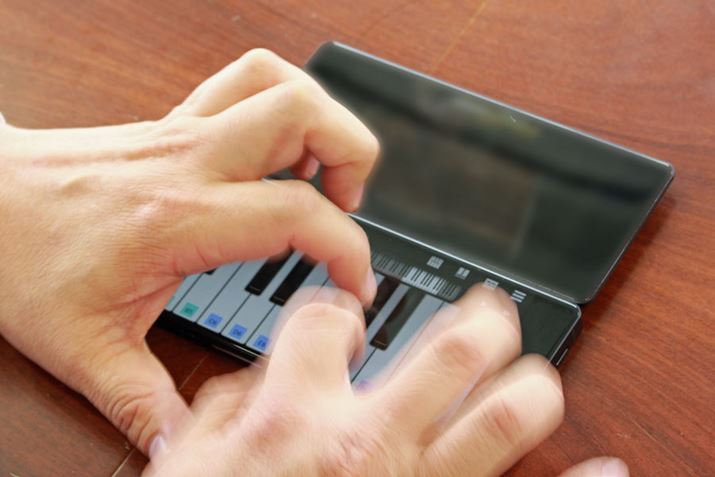 2画面のユニークな使い方として、ストリーミング動画の演奏に合わせて、キーボードアプリでの合奏を披露。音楽が大好きだという大平部長が、高速のタッチ演奏を実演してくれた