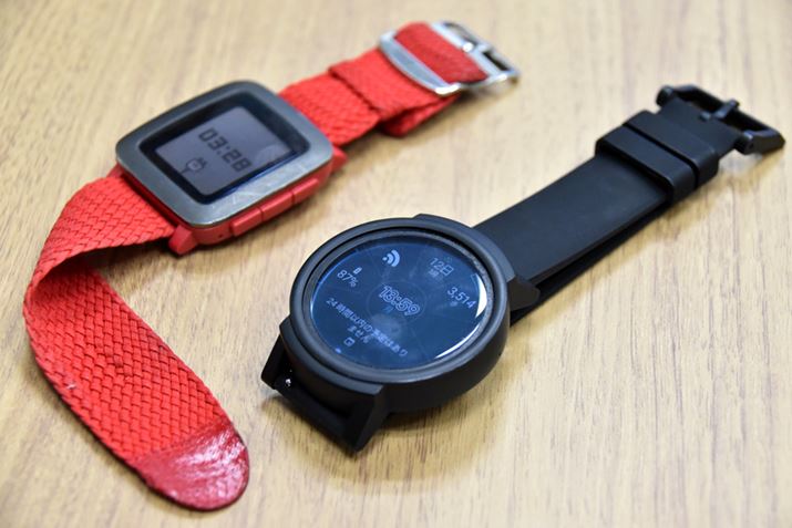 壽氏が所有するスマートウォッチ(画像左から「Pebble Time」と「TicWatch 2」)。TicWatch2は画面が大きく、ちょっとしたニュースが読めるのが便利
