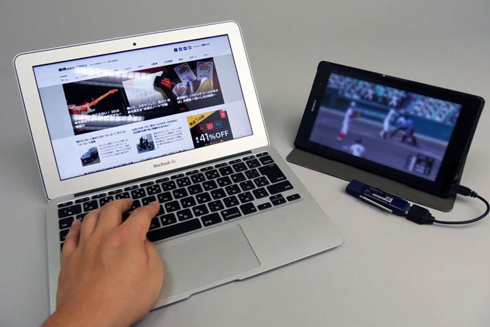 ノートPC、MacBook Air、タブレット、スマートフォンでテレビ番組を視聴。タブレットとスマートフォンでの視聴時は、microUSB変換ケーブルがじゃまに感じることもありましたが、おおむね満足