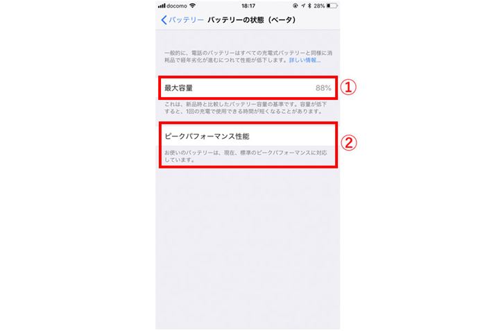 (1)が蓄電容量で、新品時を100%にした場合の割合。(2)ピークパフォーマンス性能の項目では、性能に制限がかかっているかわかる