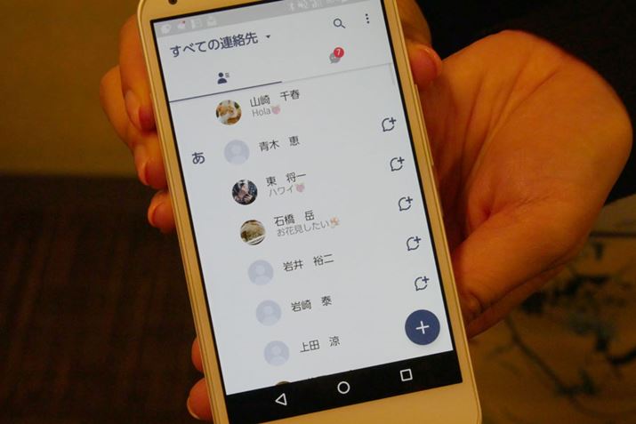 「+メッセージ」の連絡帳。名前の右に吹き出しのアイコンが表示されている相手には「+メッセージ」を、何も表示されていない相手にはSMSのみ送信可能