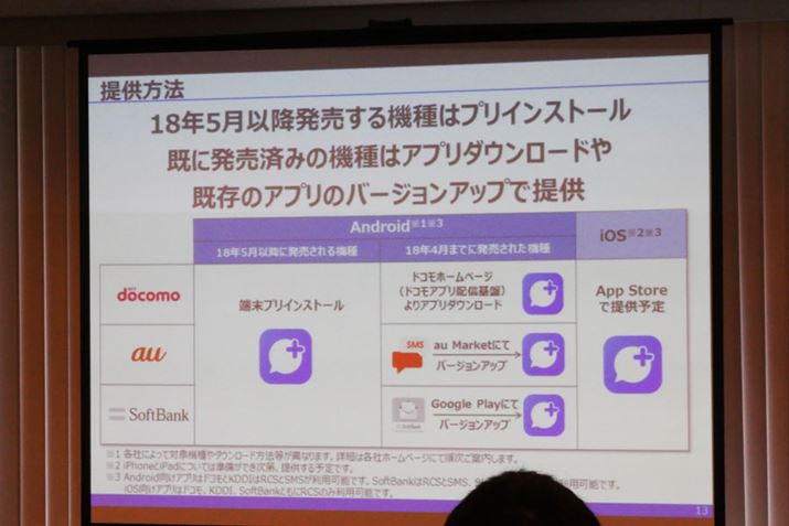 2018年5月以降に3社から発売されるスマートフォンとタブレットには「+メッセージ」がプリインストールされます。18年4月までに発売される機種に関しては、アプリのインストールやアップデートで対応。iOSについては、App Storeで「+メッセージ」を提供予定