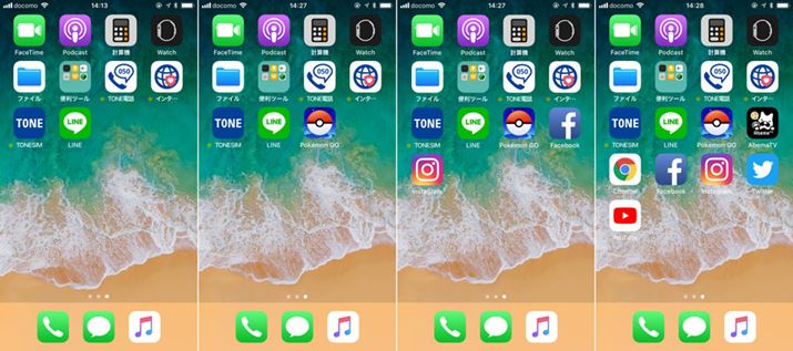 TONE SIMをセットしたiPhone 7に対してレーティングによる機能制限を適用したところ。左から「9歳未満に制限」「12歳未満に制限」「17歳未満に制限」「制限しない」の順。対象年齢が下がるにつれて使えるアプリも少なくなっていくのがわかる