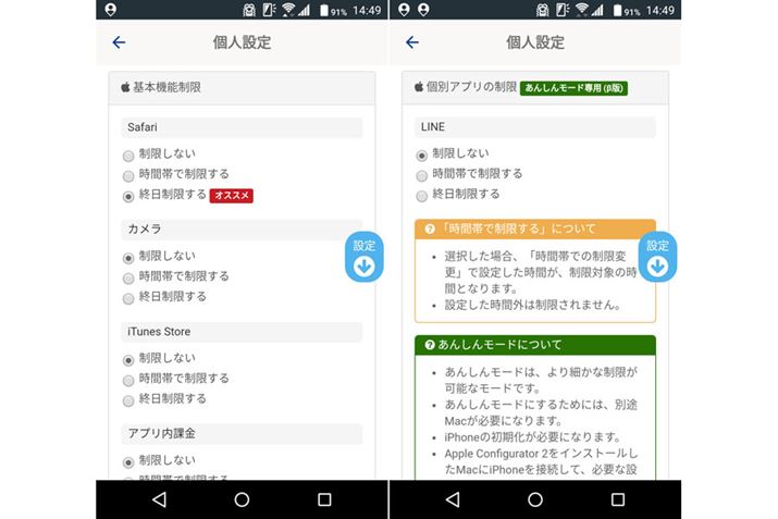 TONEファミリーの設定画面より。標準アプリの一部は個別に制限ができる(左)。あんしんモードを有効にすると、追加インストールしたアプリについても個別制限が可能(右)