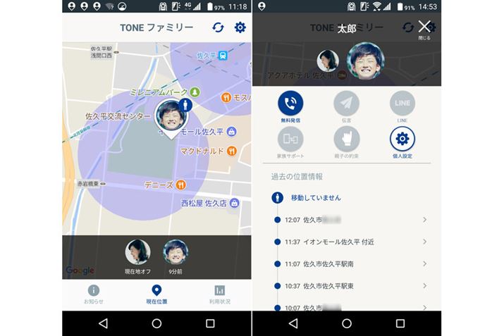 TONE見守りの起動時には子どもの現在地が地図上に表示される。地図上の青い円は後述する「ジオフェンス」の登録エリア(左)。子どものアイコンをタップすると、過去の位置情報履歴を参照できる(右)