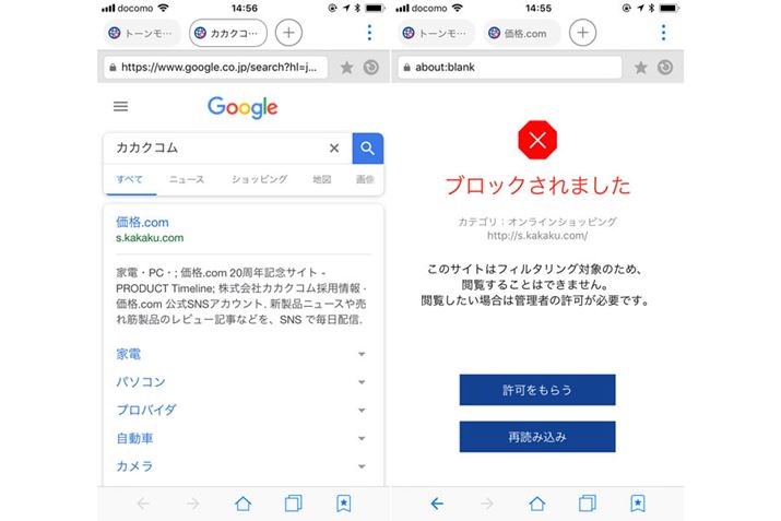 あんしんインターネットの専用ブラウザー。一般的なブラウザーアプリと比べて使い勝手に大きな違いはない。検索エンジンはGoogleに対応(左)。許可されていないカテゴリーのWebサイトは閲覧がブロックされる。保護者に対してホワイトリストへの登録許可を求めることも可能(右)
