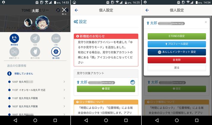 位置情報履歴を表示する画面で「個人設定」をタップし(左)、見守り対象アカウントの「設定」をタップすると(中)、TONEファミリーやあんしんインターネットの設定画面を開くためのボタンが表示される(右)
