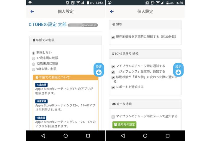 TONEファミリーの設定画面では、アプリのレーティング制限(左)や各種通知の有無(右)など、すべての設定項目が1画面に詰め込まれている