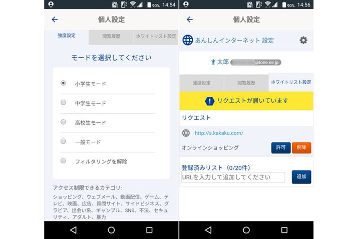 フィルターの強さは「小学生」「中学生」「高校生」「一般」の4モードに分かれている。特定のWebサイトに限りアクセスを許可するホワイトリストにも対応する(最大20件まで)。