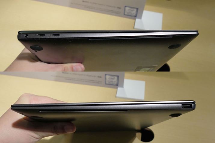 左側面にはイヤホンジャックとUSB Type-Cポートを2基。そのうち1基はThunderbolt 3に対応。右側面にはUSBポートを備える。SDカードスロットもあればベターだった