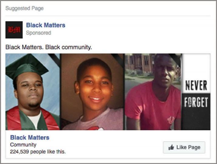 実際に配信されていたフェイスブック広告の一例。これはアフリカ系アメリカ人のコミュニティをターゲットとして配信されていた