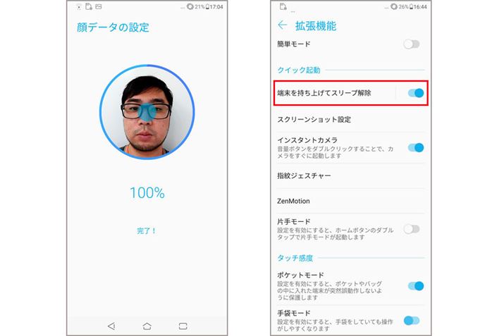 「ZenFone 5」はフロントカメラを使った顔認証に対応。端末を持ち上げてスリープを解除する機能と一緒に使うと、わざわざ電源ボタンを押さずに済むので便利だ