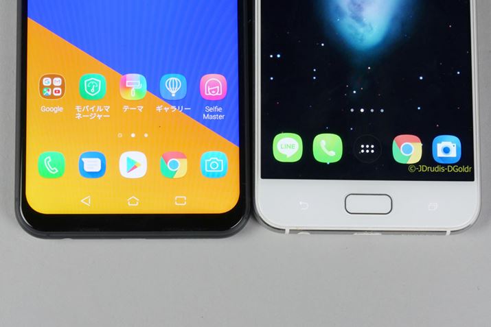 ディスプレイはFHD+(2246×1080、19:9)のSuper IPS+液晶を搭載。IPS液晶の「ZenFone 4」と比べると色彩が鮮やかになっており、最初に見たときは有機ELかと思うほどきれいに感じた。