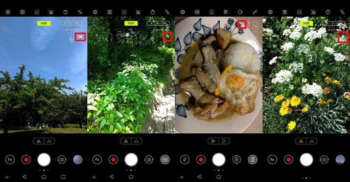 AIオートでは、被写体やシーンを認識すると、撮影画面にそれぞれのシーンに応じたアイコンを表示。人、フード、スカイ、ナイト、フラワーなど合計16の撮影モードを自動で選んでくれる。なお、標準カメラと広角カメラの両方で動作する