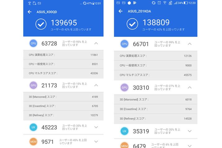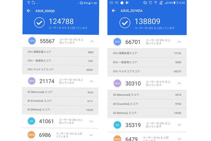 AIブーストをオンにすると、「ZenFone 5」(左)が「ZenFone 4」(右)を若干上回る結果になった。ただし、CPUとGPUのスコアは「ZenFone 4」のほうが高いスコアを記録した
