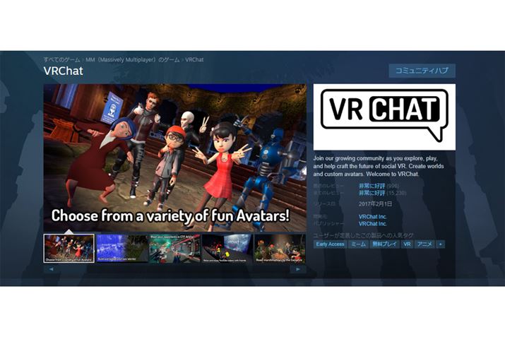「VRChat」。MMDデータ(モデルデータ)から自作したアバターや、「ニコニコ立体」などで配布されているMMDデータを使って、世界中のユーザーとチャットを楽しめるサービス。ユーザーが作成した、さまざまなワールドを見て回れる