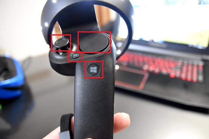 モーションコントローラーの正面。視野の回転やテレポートに使うサムスティック(左上)、ゲームによってさまざまな機能を割り当てられるタッチパッド/Zクリック(右上)、メニューを呼び出すときに使うメニューボタン(中央)、「Windows」キーの役割を担うWindowsボタン(右下)を備える