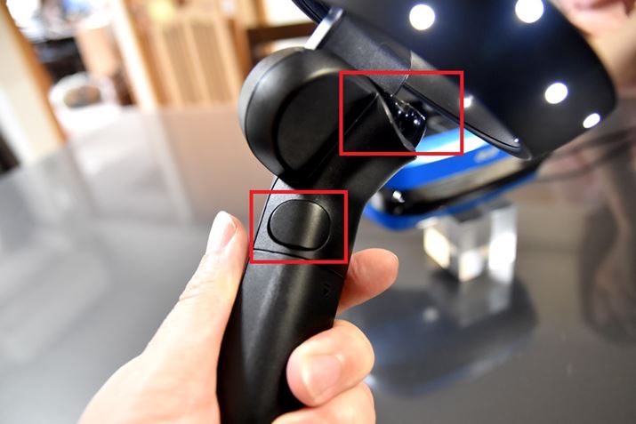 モーションコントローラーの側面。「選択」するときに使うトリガー(上)、何かを「つかむ」ときに使うグラブボタン(下)がある