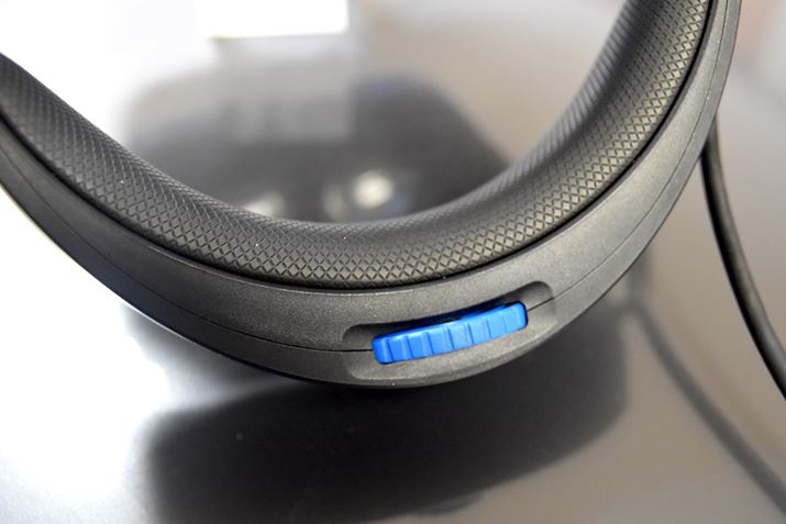 ヘッドセット後部には、青いダイヤルがある。これをクルクル回して、周径を広げたり、狭めたりして、ホールド感を調整できる