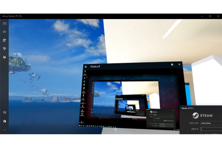 VR上で、Windowsのデスクトップを表示した。VRのプレビューを表示しているので、何層にも重なって見えるが、モーションコントローラーを使って操作できる
