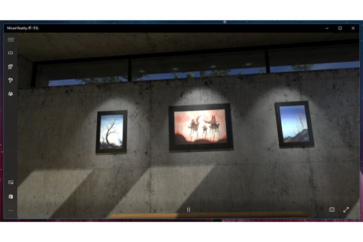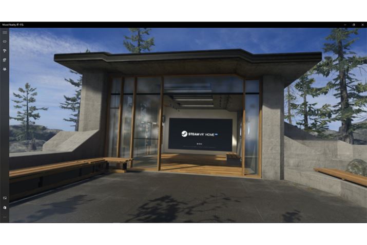 チュートリアルをひと通り終えると、「Windows HOME」と呼ばれる場所に移る。Windows HOMEは、大自然の中にぽつりと建っている豪邸で、Windows MRの要となる空間。わかりやすく言うと、「ホーム画面」のような役割を担っており、たとえば、Windowsのデスクトップを起動したり、アプリケーションを呼び出して、自由に操作したりできる。