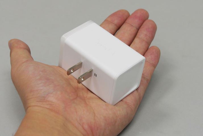見た目は非常にシンプルで、サイズも大きくありません。横幅が長いため、複数口がある電源タップで使うと左右の口をじゃましてしまいますが、高さが抑えられているので、差込口が縦に並んだ普通タイプのコンセントならじゃまにならないでしょう。