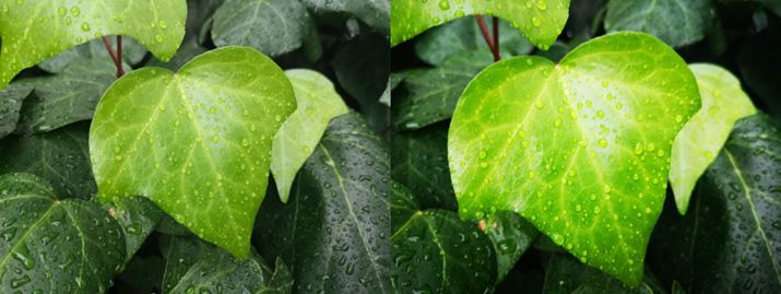 左がAIオフ、右がAIオン。左のほうが自然な色味だが、右はSNSなどに投稿するのに向いたビビッドな雰囲気に仕上がっている