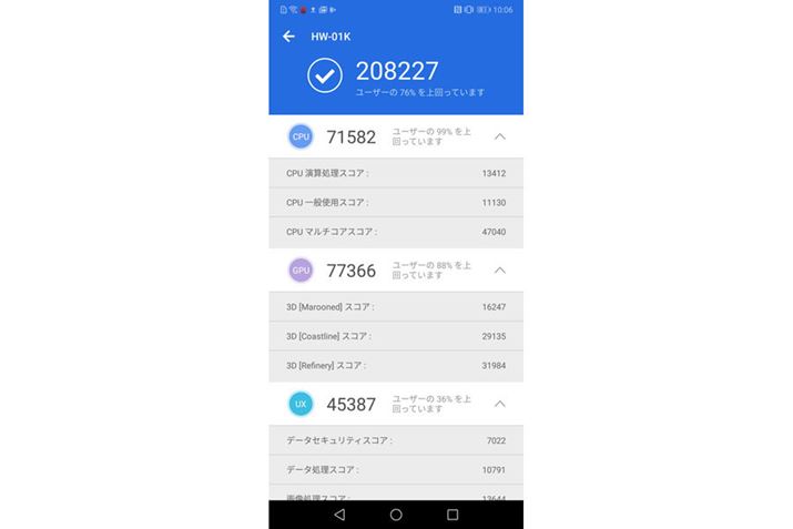 ベンチマークソフト「AnTuTu Benchmark(7.0.8)」でテストしたところ、総合スコアは208277だった。最新のAndroidスマートフォンに搭載されているCPU「Snapdragon 835」と同等レベルだ。さすがに「Galaxy S9/S9+」には劣るが、それでもハイエンドスマートフォンの中でも高いスコアだ。