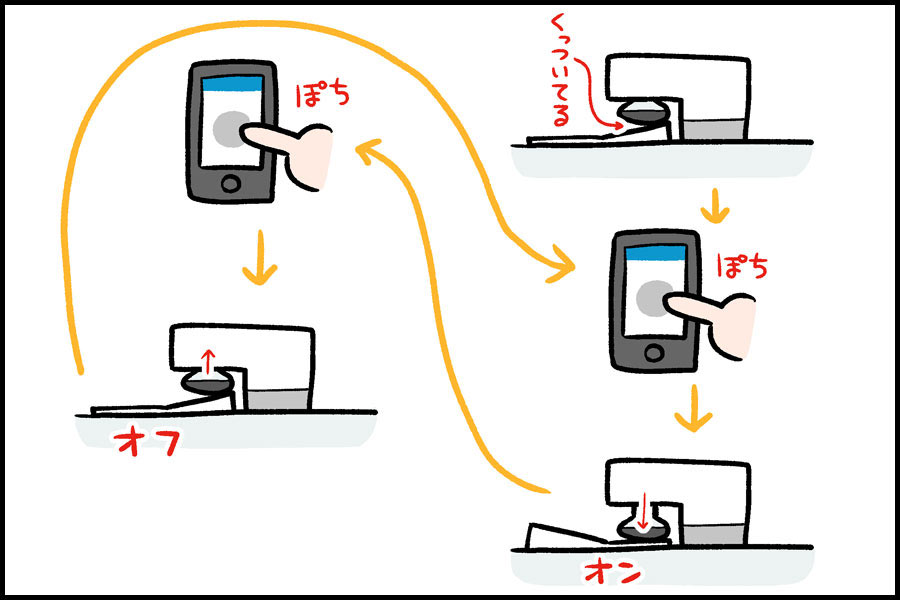 スマホ連動! ……といいつつも思いっきりアナログな仕組みですが、とにかくコレさえあれば、押しボタンで動作する家電を遠隔操作できるようになります。