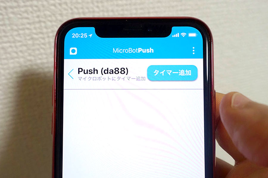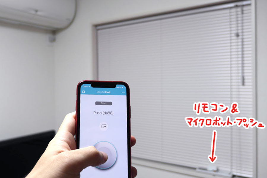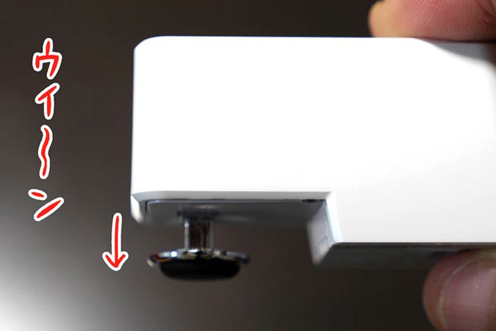 スマホアプリのボタンを押すと「マイクロボット プッシュ 2nd Generation」のアームがニューッと伸びるんです。
