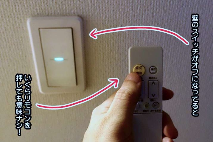 たとえば……今時のシーリングライトは、ほとんどリモコン対応しているので、こんなことしなくても手元でつけたり消したりできますよね。でも、壁のスイッチが「オフ」になっていたら、いっくらリモコンをいじくっても無反応。