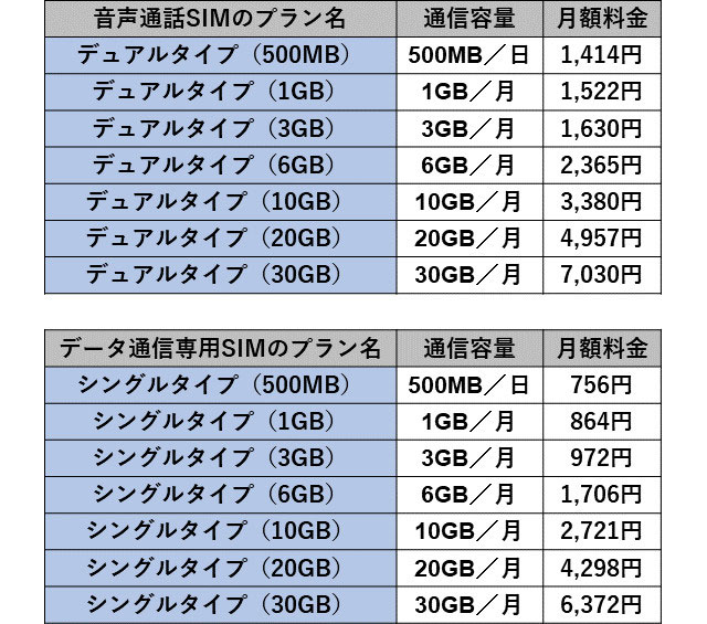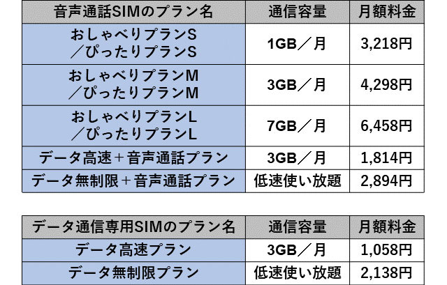 また、通話料割引が付かない「データ高速+音声プラン」「データ無制限+音声プラン」も選択可能。こちらはデータ通信専用SIM(SMS機能付き)を選べる。