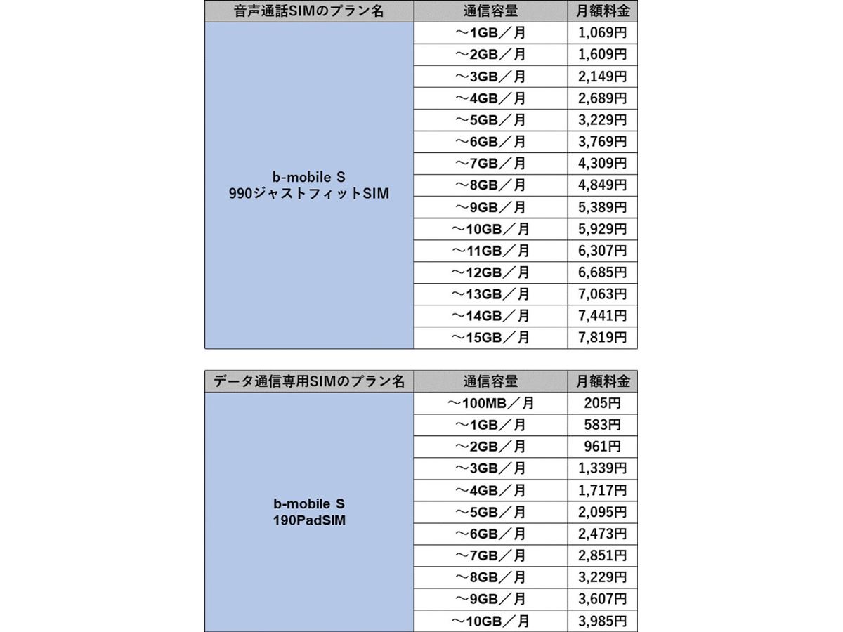 日本通信のb-mobileは、ソフトバンク網に対応した格安SIMを提供している。音声通話ができるiPhone向けの「b-mobile S 990ジャストフィットSIM」は毎月実際の通信量から月額料金が決まる段階制の料金プランとなっており、通信容量は1GBから上限の15GBまで1GBごとに変化する。5GBから15GBまでの範囲からユーザー自身が上限を決めることも可能で、契約時は10GBに設定されている。使いすぎを防ぎやすい料金プランだ。