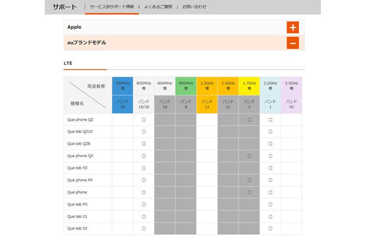 auが機種ごとに公開している対応周波数帯の一覧(auのWebサイトより)。iPhoneやiPadはauが使っていない周波数帯にも広く対応している