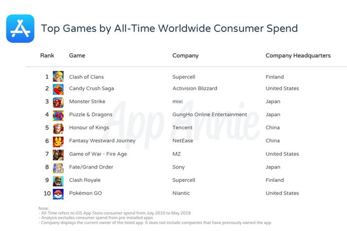 ゲームアプリの消費総額ランキング。「モンスターストライク」は3位、「Fate/Grand Order」は8位、「ポケモンGO」は10位