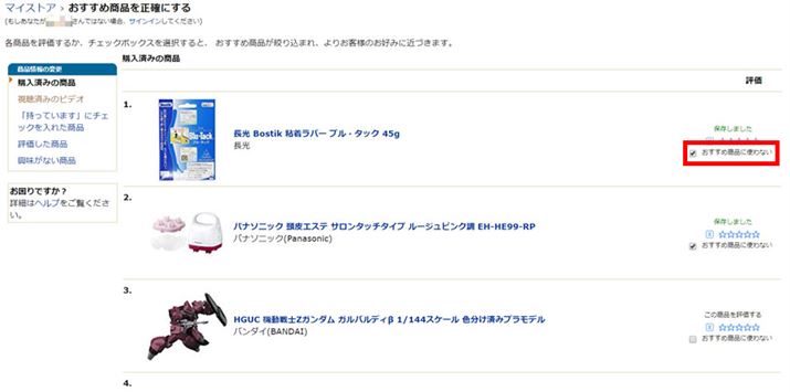 商品一覧の右端にある「おすすめ商品に使わない」にチェックを入れる。ぺージ左側で「購入済みの商品」「視聴済みのビデオ」などを切り替えられる