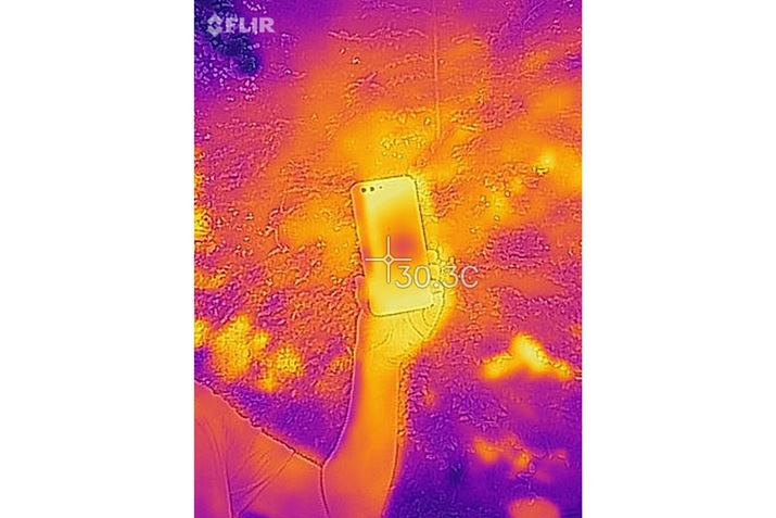 15分後に背面の温度を測ると、なんと30.3℃にまで低下していました! サーモグラフィーの色は明らかに青く、温度が低下しているのがわかります。手で触ってみても違いがわかるくらいヒンヤリしており、ペルチェ素子の“効果はばつぐん!”です。ただし、シートを当てていた場所以外は、多少冷却されたものの熱が残っていました