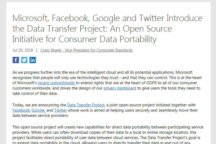 しかし、マイクロソフト、Facebook、Google、Twitterが今回立ち上げたプロジェクト「Data Transfer Project」(以下、DTP)により、異なるサービス間であっても簡単にデータを移行できるようになります。