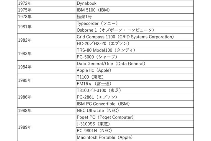 そうなんですよね。実は、PCもモバイルの重要なジャンルなわけですが、その歴史を振り返ってみると、1981から1984年は、PCのカンブリア紀とも言える時期で、多彩なモデルが生み出されているんです。このころに、ほとんどの本体形状や音楽・ビデオなどの用途も提案されています。その中にモバイルPCも登場していますので、ザッと思いつくものをあげて表にしてみました。今回は、フルキーボードを備えたものという条件で選んでみましたが、ポケコンやポータブルワープロ、ポータブル端末などは含んでおりませんので、ご了承ください。