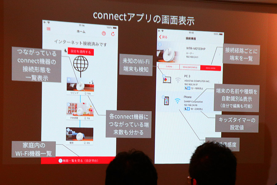 使いやすさの点では、中継機のベストな配置から設定まで一元的に管理できる「connectアプリ」(iOS用/Android用)を用意。中継機には電波強度を測定できる機能が盛り込まれており、アプリ上で電波の強さを見ながら、設置可否を判定できる。ほかにも、有線するバンドや使用禁止時間を設定できるキッズタイマーなども備える。