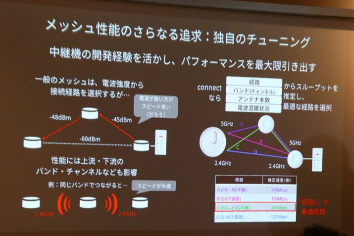 経路やバンド、アンテナ本数、電話の混雑状況からスループットを推定し、最適な経路を選択することで、メッシュネットワークのパフォーマンスを高めている