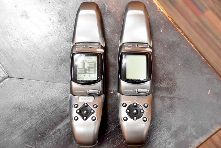 「世界初のスマートウォッチとも言うべきモデル」と入鹿山氏が語った「WRISTOMO」。「試作機まで作ったが、発売されることがなかった」というのが、写真左側のモデル。「Bluetooth」の文字が見える