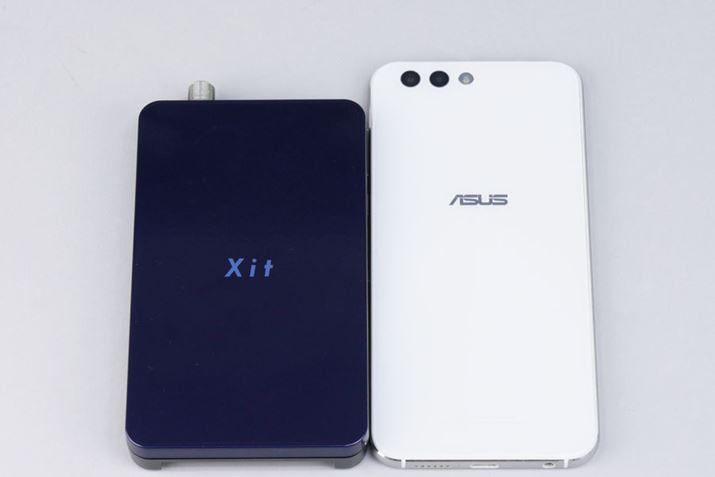 「Xit Brick」のサイズは、78(幅)×132(縦)×18(厚さ)mm。分厚いものの、5.5型スマートフォンと並べると一回り小さく見えます
