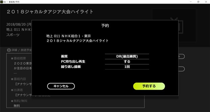 録画予約時は、画質、PC持ち出し再生(後述)、繰り返し録画(1回、毎日、毎週など)を指定できます。録画予約の方法は、一般的なブルーレイレコーダーとほとんど同じです