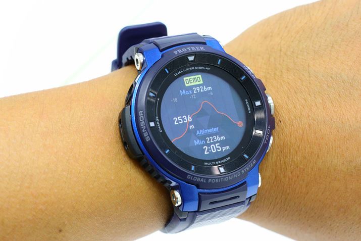 WSD-F20のモノクロ画面では時刻しか表示できなかったが、高度・気圧・方位の一括表示が可能となった。さらに、スマホとの通信とカラー画面をオフにして、モノクロ画面で時刻表示のみに特化した「タイムピースモード」が「マルチタイムピースモード」となり、表示できる情報量がアップ。高度・気圧などのセンサー情報を同時に表示できるようになりつつ、電池寿命はタイムピースモードと変わらない約1か月の長さを実現した。