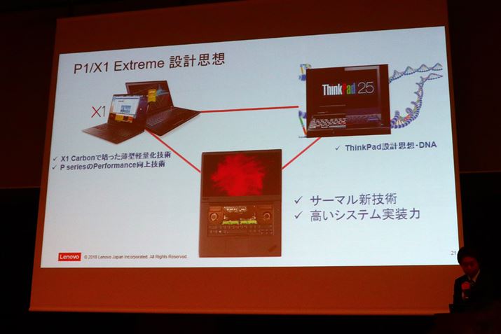 同日に東京都内で開催された発表会では、ThinkPad X1 Extremeの開発秘話などが披露された。同モデルは先月発表したワークステーション「ThinkPad P1」の兄弟機種であり、筐体や設計で共通点が多いという。