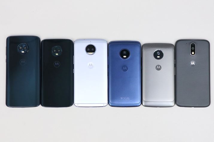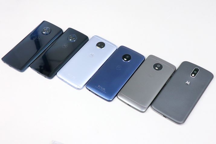 左からMoto G6 Plus、Moto G6、Moto G5s Plus、Moto G5 Plus、Moto G5、Moto G4 Plus(今回はMoto G5sは準備できなかった)。カメラ部分の丸形デザインはMoto G5/G5 Plusから始まっている。本体背面中央のモトローラロゴは、彫り込みやプリントなど処理の仕方は違えど、Moto G4 Plusから変わらずに配置されている