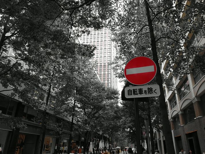 「スポットカラー」は残したい色の部分をタップするだけなので簡単に利用できる。写真は、車両進入禁止標識の赤をタップして撮影したもので、印象的な写真を簡単に撮れた