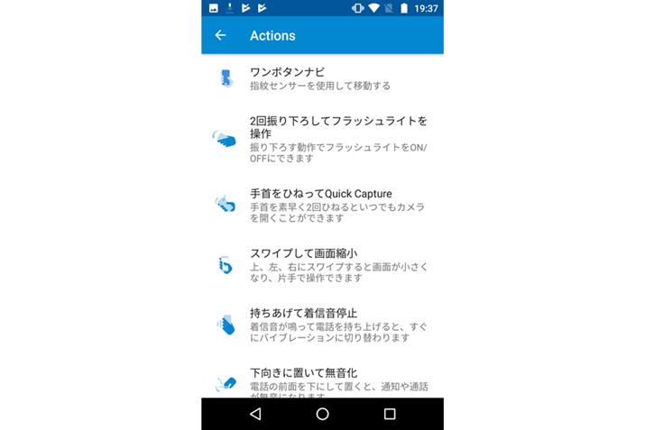 そのほかにも本体を素早く2度ひねるとカメラが起動する「クイックキャプチャ」、2度振り下ろすとフラッシュライトをオン/オフできる「フラッシュライト操作」、持ち上げて着信音停止、下向きで無音化など、本体を動かしてさまざまな操作ができる「Motoアクション」も便利だ(機種によって使える機能は微妙に異なる)。